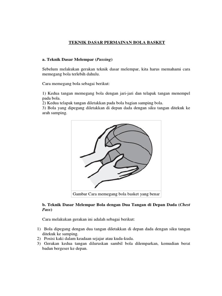 Dan salah satu teknik dasar yang terlebih adalah teknik melempar bola basket. Assist adalah suatu istilah dalam permainan bola basket dimana seorang pemain mengoper bola kepada temannya, dan pemain yang mendapat bola operan dari temannya itu tanpa mendribble (memantulkan bola ke tanah) langsung melempar atau memasukkan bola kedalam jaring basket (bola yang tidak masuk tidak dihitung). Dalam melakukan permainan bola basket,tentunya membutuhkan sarana dan prasarana agar permainan bola basket dapat berjalan. Melempar dan menangkap bola setinggi dada ( chest pass ) dalam permainan bola basketmelempar dan menangkap bola melewati atas kepala ( overhead pass ) dalam. Air pass adalah melempar bola tanpa menyentuh lantai. 24.1.2 dribble dimulai ketika seorang pemain, mendapatkan penguasaan atas bola hidup di lapangan. Bola basket merupakan permainan beregu yang dimainkan lima orang dalam setiap regu. Teknik passing bola basket yang berikutnya adalah bounce pass. Regu yang paling banyak dapat memasukkan bola kedalam keranjang adalah regu yang menang dalam permainan ini. Bola basket sangat cocok untuk ditonton karena biasa dimainkan di ruang olahraga tertutup dan hanya memerlukan lapangan yang relatif kecil. Di indonesia menetapkan aturan standar ukuran lapangan bola basket yang berbeda dengan standar. Dalam permainan bola basket, passing memiliki beberapa macam. Dalam permainan bola basket seperti yang kita ketahui terdapat beberapa teknik dasar yang harus mampu dikuasi oleh setiap pemain disemua posisi.